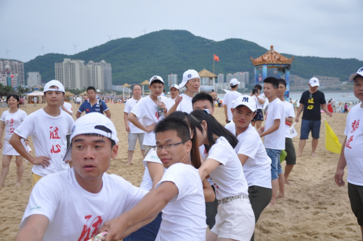 拔河比賽是適合團隊培養凝聚力的活動,在細膩柔軟的沙灘上,有碧海藍天做背景,是不是更適合拔河,我們要更拼出我們的團結我們的力量來,不能辜負海陵島這美麗的海景啊!